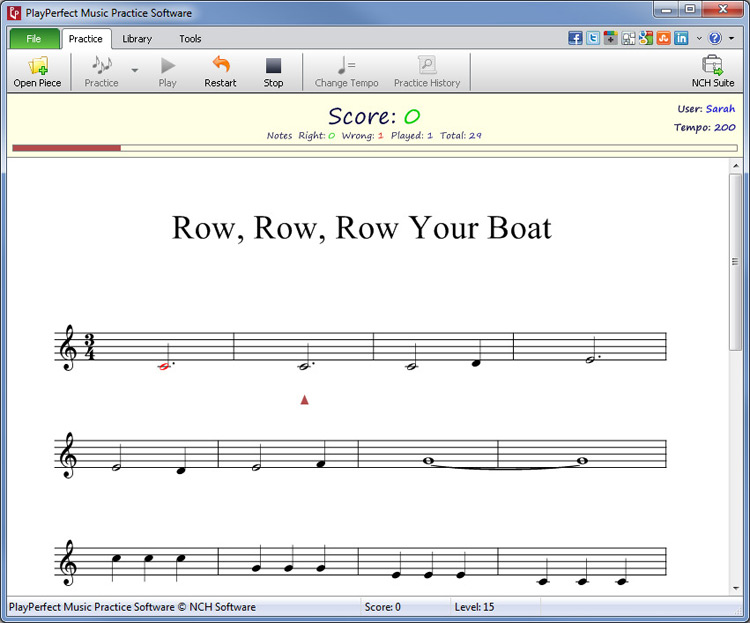 First play a song to know how it should sound. Use the automatic metronome so that your synchronization is perfect. Set the tempo as fast or slow as you need. The notes will change color as you play them so you can see how they are doing.
