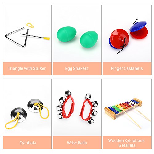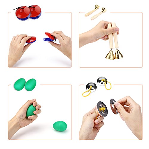 13. Hand bells x 2This set of musical instruments for children includes 12 pieces, which are made of non-toxic material and high quality, such as wood, plastic, metal, etc. It is safe for children.