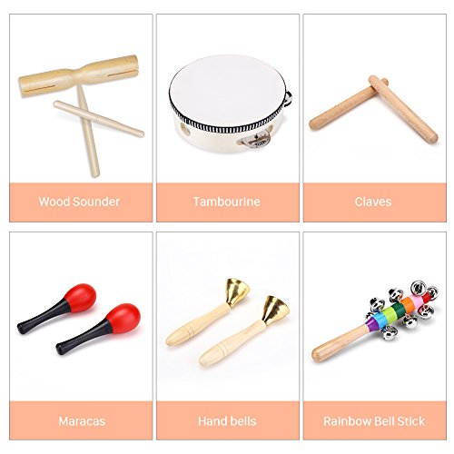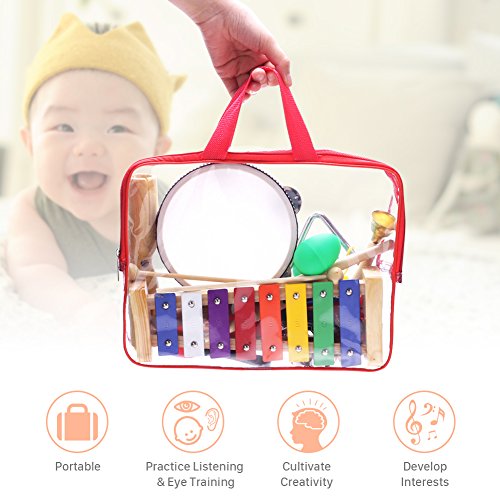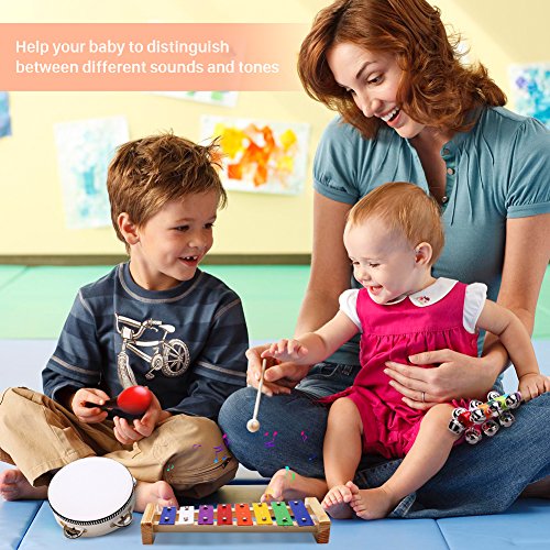 Perfect design. This 12-piece musical instrument is very colorful, which is attractive to children. It includes all kinds of instruments, such as wooden Xylophone, Wooden Probe, Tambourine, Wristbands, etc., which is suitable for both the individual game and the group, so it will bring lots of fun to children.